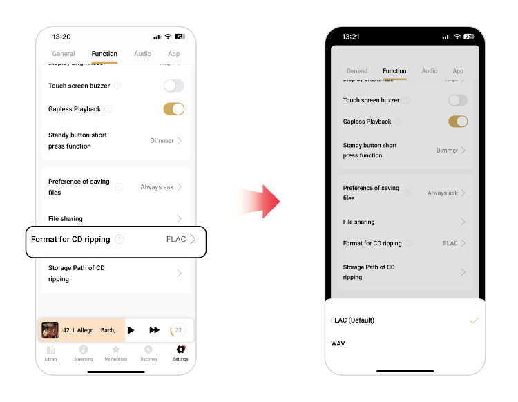 Open the MA Romote App, go to [Settings - Function ] → [Format for CD Ripping]. You can now choose between FLAC and WAV.
