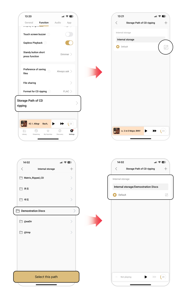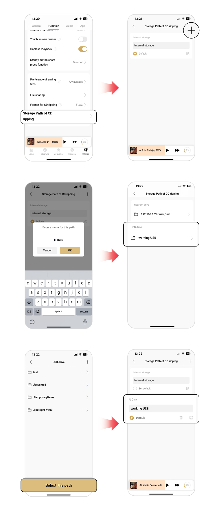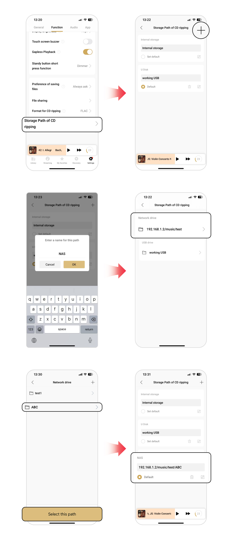 [Settings - Function] → [Storage Path of CD Ripping] → Create New NAS Path → Select NAS → Select/Create New Folder → Set as [Default]
