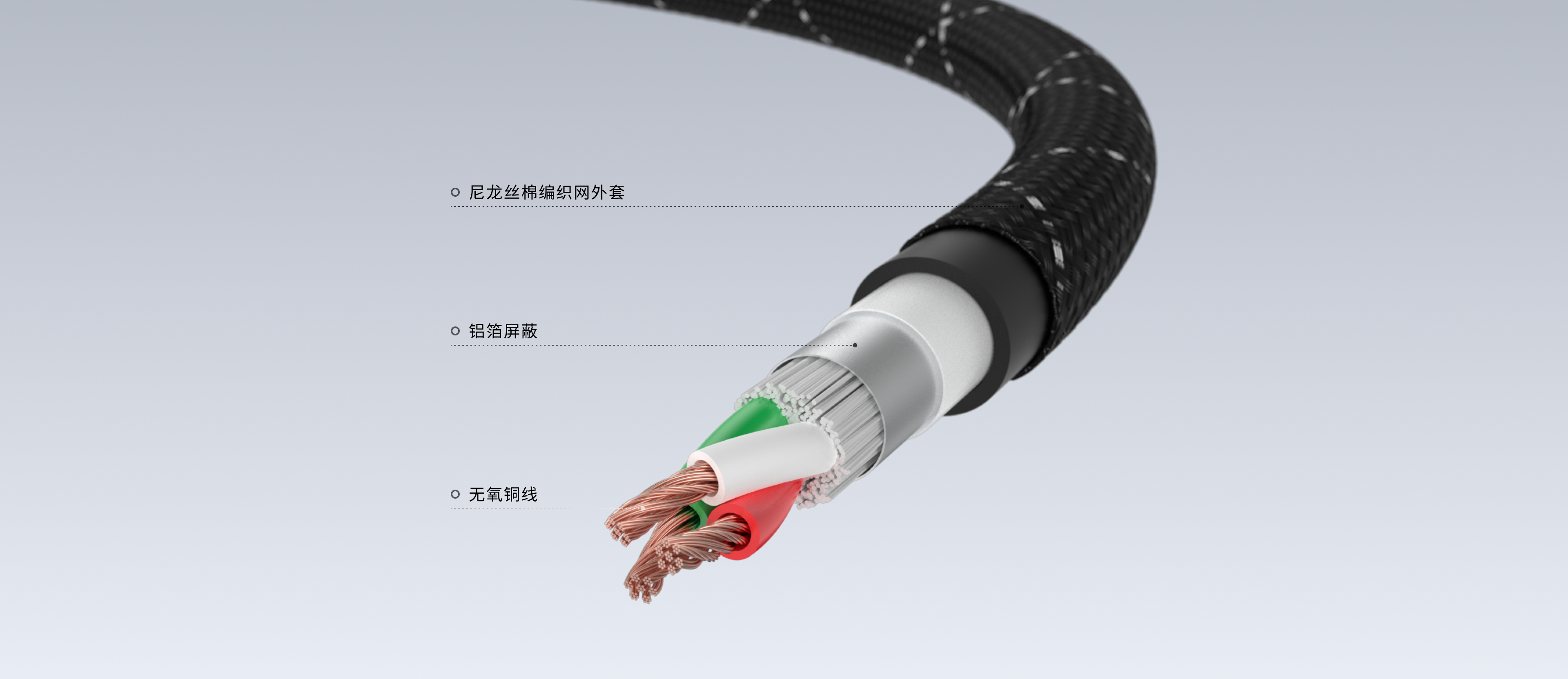 线身采用3股2.5mm²的无氧铜线绞合而成,每股使用7条绞合线再次绞合,每条绞合线使用7根0.25mm²的6N无氧铜丝编织。内芯填充棉纱与棉纸,使线身柔软可塑,外层采用铝箔屏蔽层和尼龙丝棉混合编织网外套,隔绝外部的电磁干扰,背景宁静、音色中正自然不加修饰。