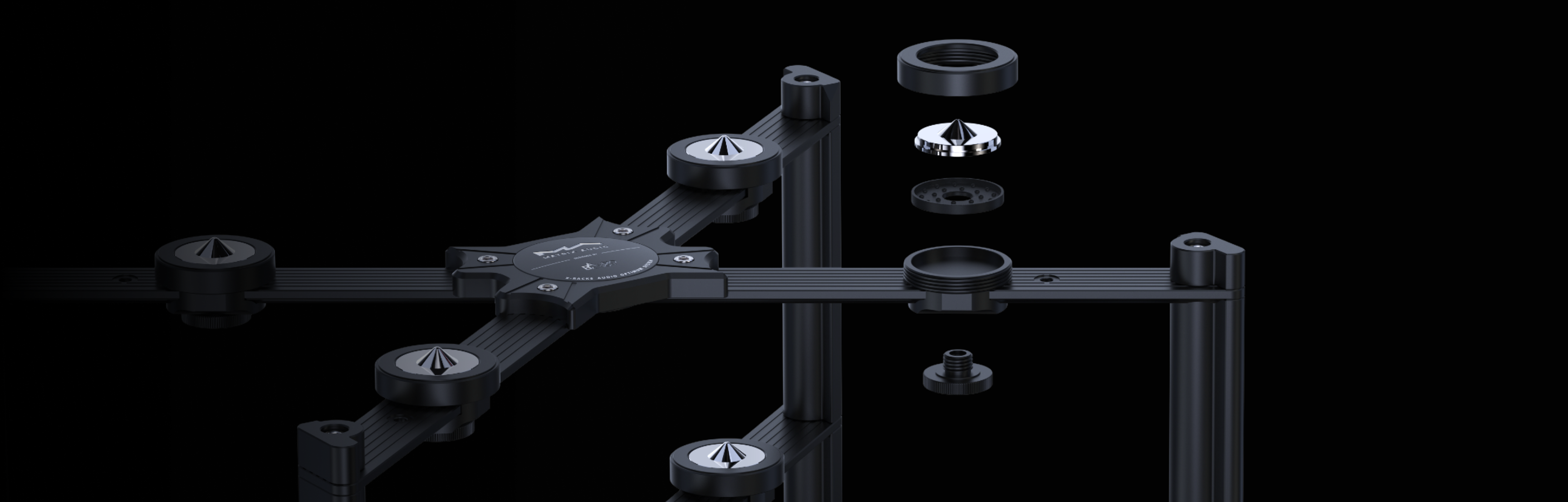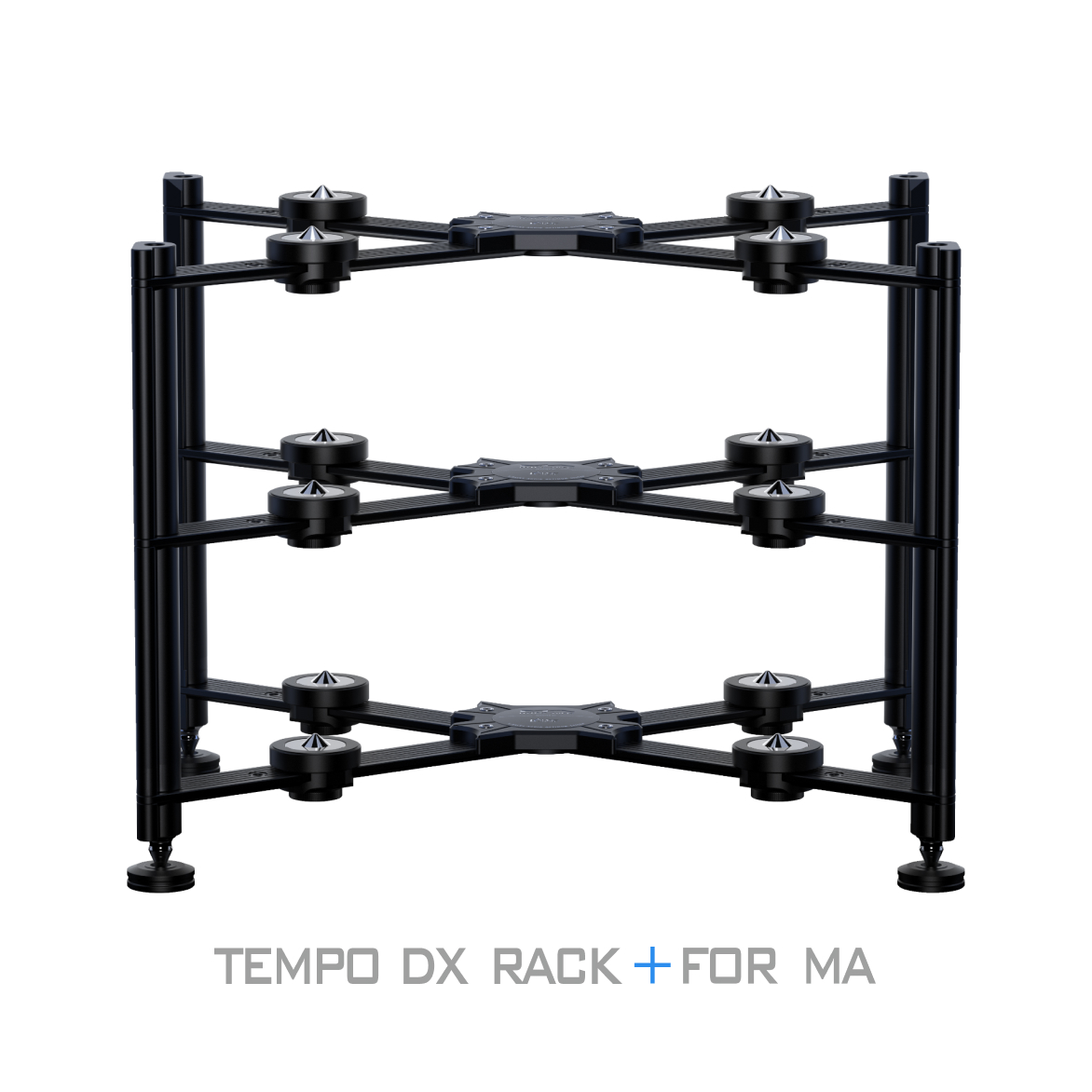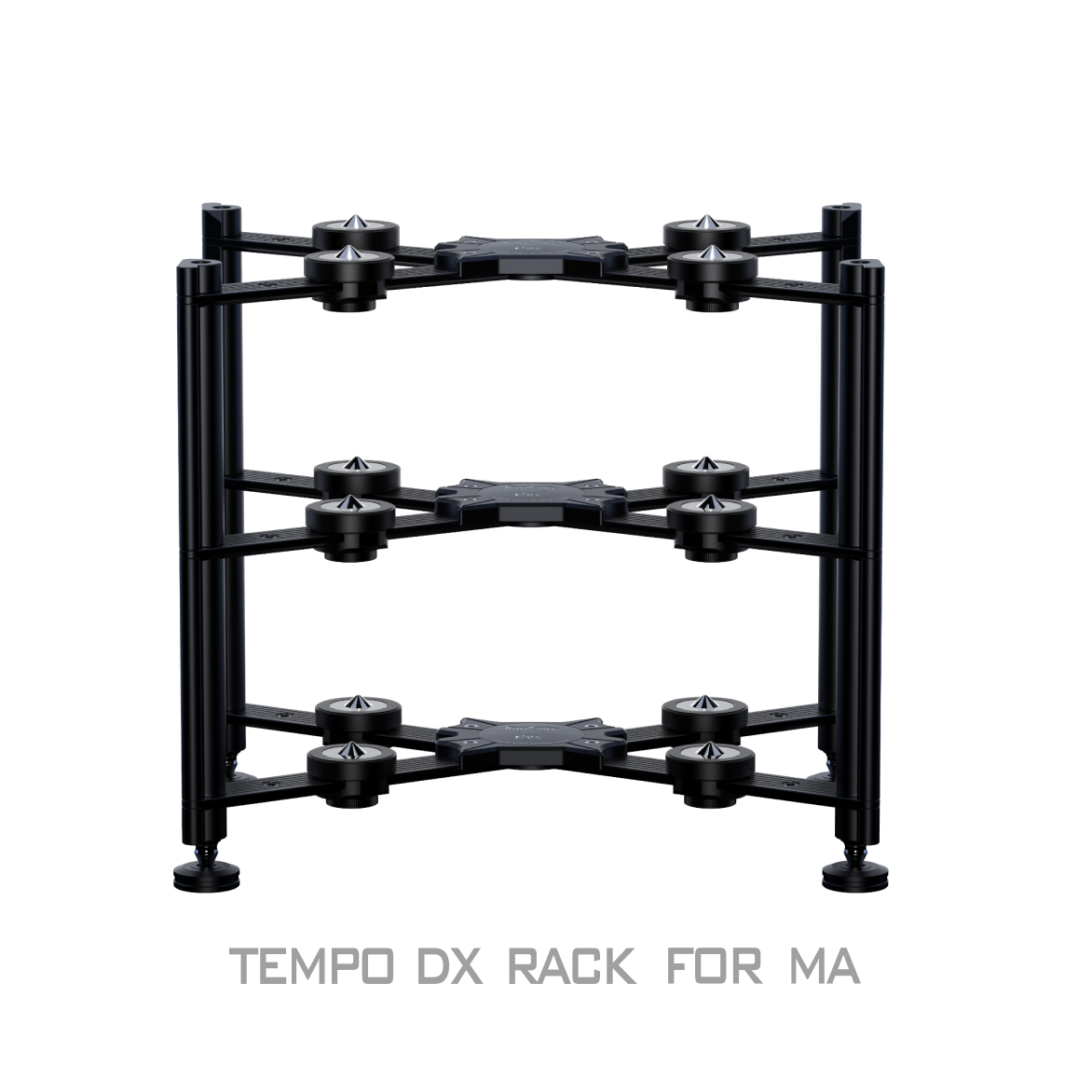 The TEMPO DX RACK adopts Audio Bastion’s proprietary X-shaped patented isolation architecture, inspired by the bolted I-beam structures used in architectural engineering. This design effectively blocks the transmission of structural resonance. The base of the rack features stainless-steel spikes that precisely interface with isolation footers in contact with the tabletop. Inside the footers, a mechanical dispersion structure composed of steel beads and silicone evenly distributes the weight of the equipment across the surface, ensuring a solid and stable foundation for every component placed on the rack.