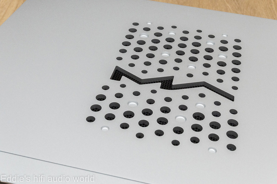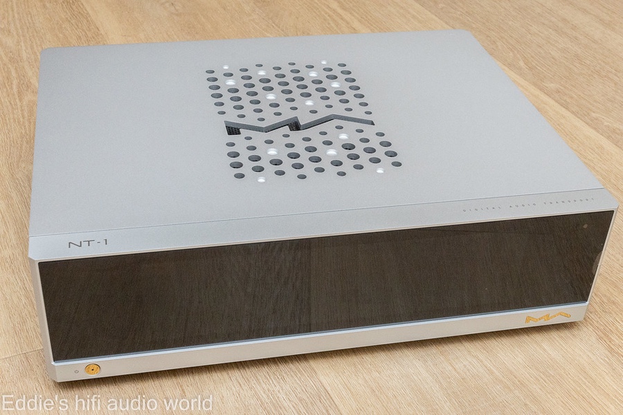 首先从外观工艺谈起:Matrix Audio NT-1 给人的第一眼印象就是精湛的做工。它拥有 4.6 公斤的净重,机身尺寸明显大于一般常见的一体式串流播放器,但实际拿起来并不显笨重。整个机壳由整块航天级铝合金经 CNC 精密加工成形,表面采用阳极处理与喷砂上色,机箱的接缝、倒角以及顶盖和两侧的大面积规律圆孔开孔都处理得一丝不茍,各处细节都相当到位。这种用料与工艺水平属于近距离检视也挑不出瑕疵的等级,充分展现出高阶发烧器材应有的质感与气度。在设计语言上,NT-1 延续了 Matrix Audio 新世代旗舰 M 系列的风格:线条简洁利落、比例拿捏克制沉稳。顶板与侧板的大量穿孔开孔不只是装饰,还兼具了机箱散热与电磁屏蔽的功能,可谓美观与实用并重。机身正面除了左上角一枚圆形金属电源按键外,几乎看不到其他传统按钮或旋钮,整体视觉信息非常干净,显得气质沉着内敛,我连想拆开上盖拍照都找不到螺丝。